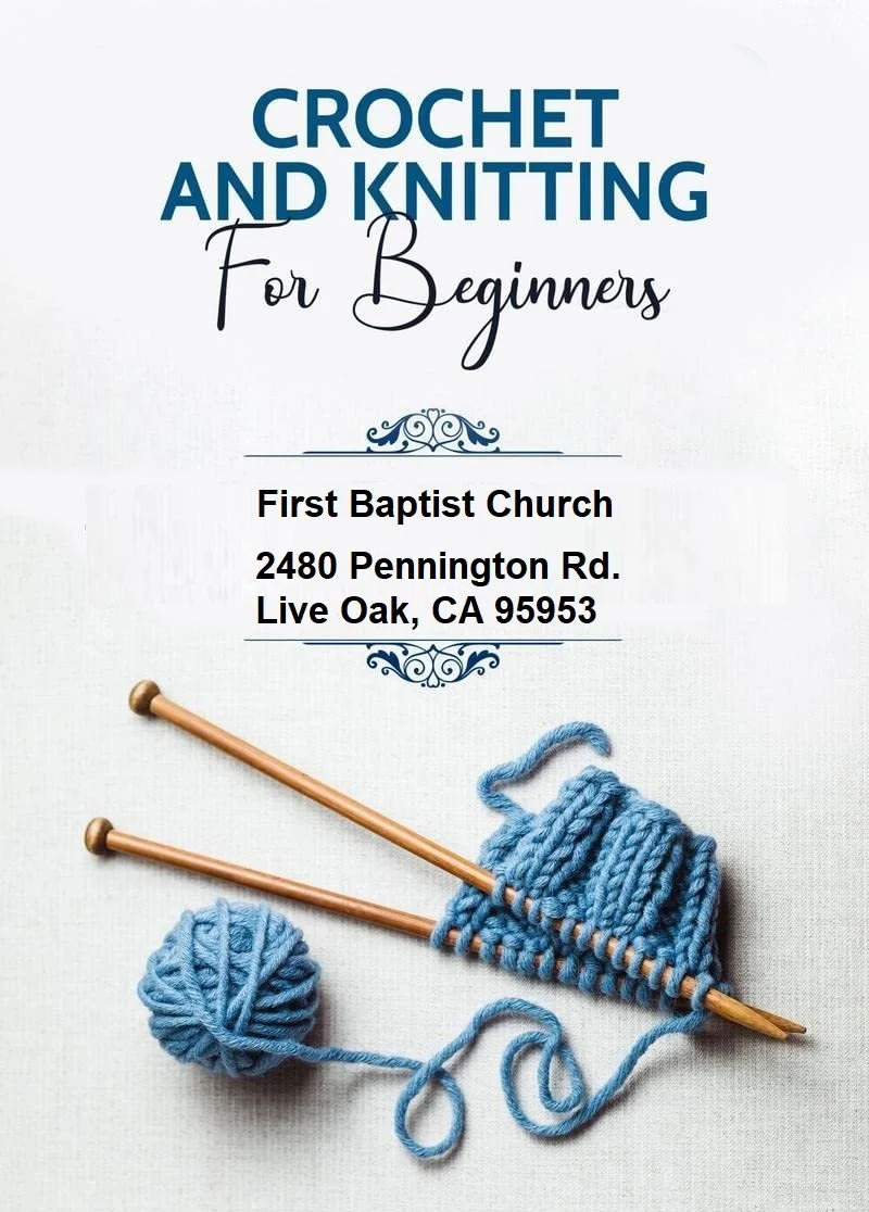 Women's Knitting & Crochet Class Saturday, March 21, 2026 1:00 PM 3:00 PM First Baptist Church 2480 Pennington Road Live Oak, CA, 95953 United States (map) Google Calendar ICS